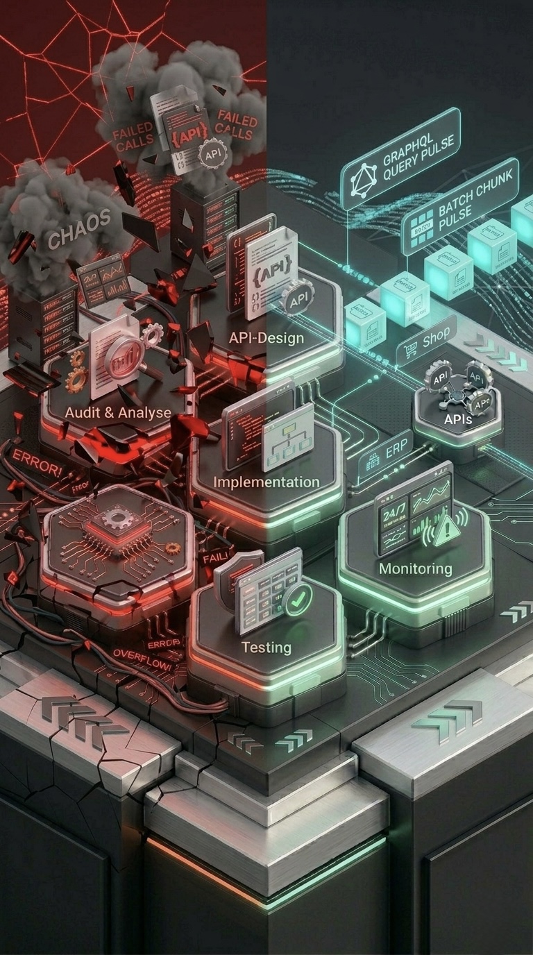 In modern e-commerce, nothing operates in isolation. Your online store needs to communicate with your ERP system (to synchronize inventory), your CRM system needs to receive customer data from the store (for targeted campaigns), and all systems need to communicate with marketplaces, payment providers, and shipping companies. APIs are the nervous system of this communication. However, many companies underestimate the complexity. A faulty API call can result in lost orders, slow data synchronization leads to overselling, and a poorly documented interface becomes technical debt that can haunt you for years. APIs are the invisible foundation of your scalability. They separate the front end and back end, allow different teams to work independently, and create the flexibility for future changes. A well-designed API architecture is the difference between a store that grows with you and one that becomes a hindrance. We follow the API-first philosophy: Before we write the first line of code, we define the interfaces. This ensures that systems are modular, testable, and future-proof from the outset - instead of having to patch up the code later. The two dominant API standards in modern e-commerce are REST and GraphQL. REST (Representational State Transfer) is the older, established standard: The server defines fixed endpoints, and the client calls these endpoints. GraphQL is the more modern approach: The client defines exactly which data it needs, without sub-questions or overrides. This is particularly valuable for headless frontends, mobile apps, and resource-critical environments. In addition, there's batch processing: Large amounts of data (e.g., 50,000 new products in your inventory system) cannot be transferred "live"—this would overload the API and the server. We implement batch jobs that run in chunks at night and reliably synchronize data without impacting live operations.