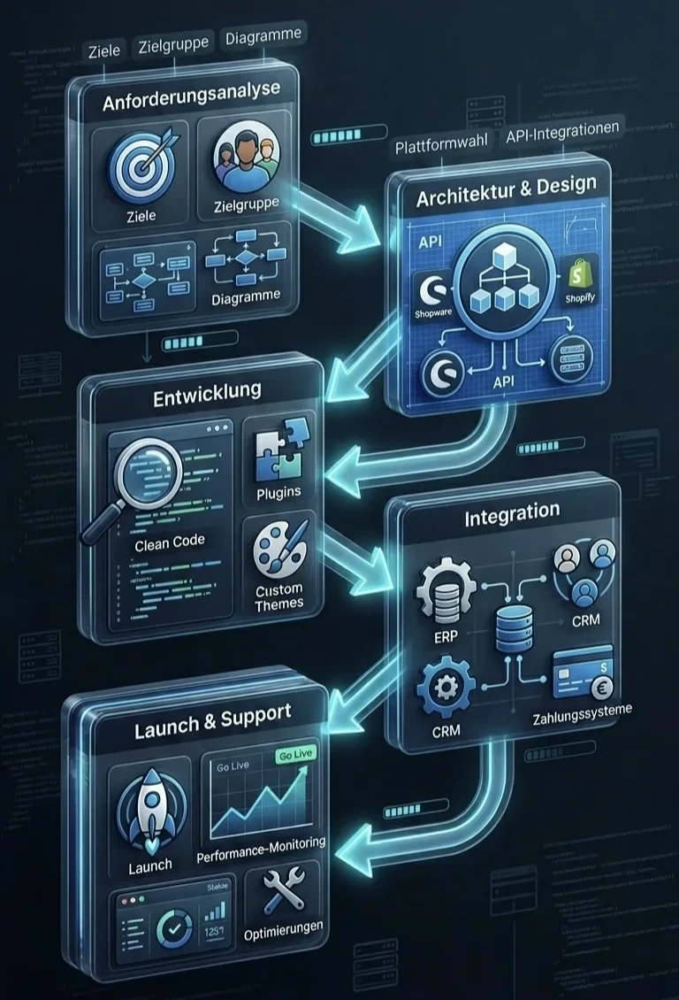 We ensure a smooth technological transition from systems like Magento, WooCommerce, or Oxid to modern solutions like Shopware 6 or Shopify. Data integrity, SEO structure, and continuous operation are guaranteed at all times.